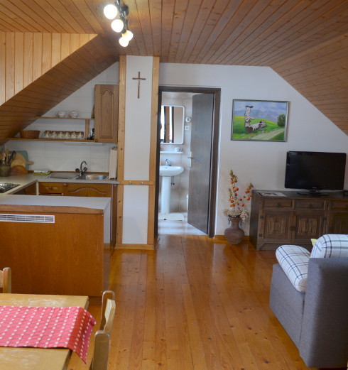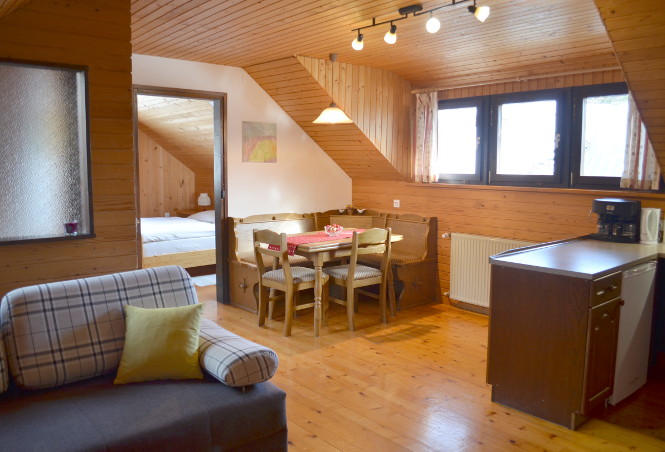 Sie können zwischen zwei Ferienwohnungen wählen. Beide sind im traditionellen Landhausstil mit viel warmen Holz eingerichtet und bieten eine schöne Aussicht auf die Umgebung.